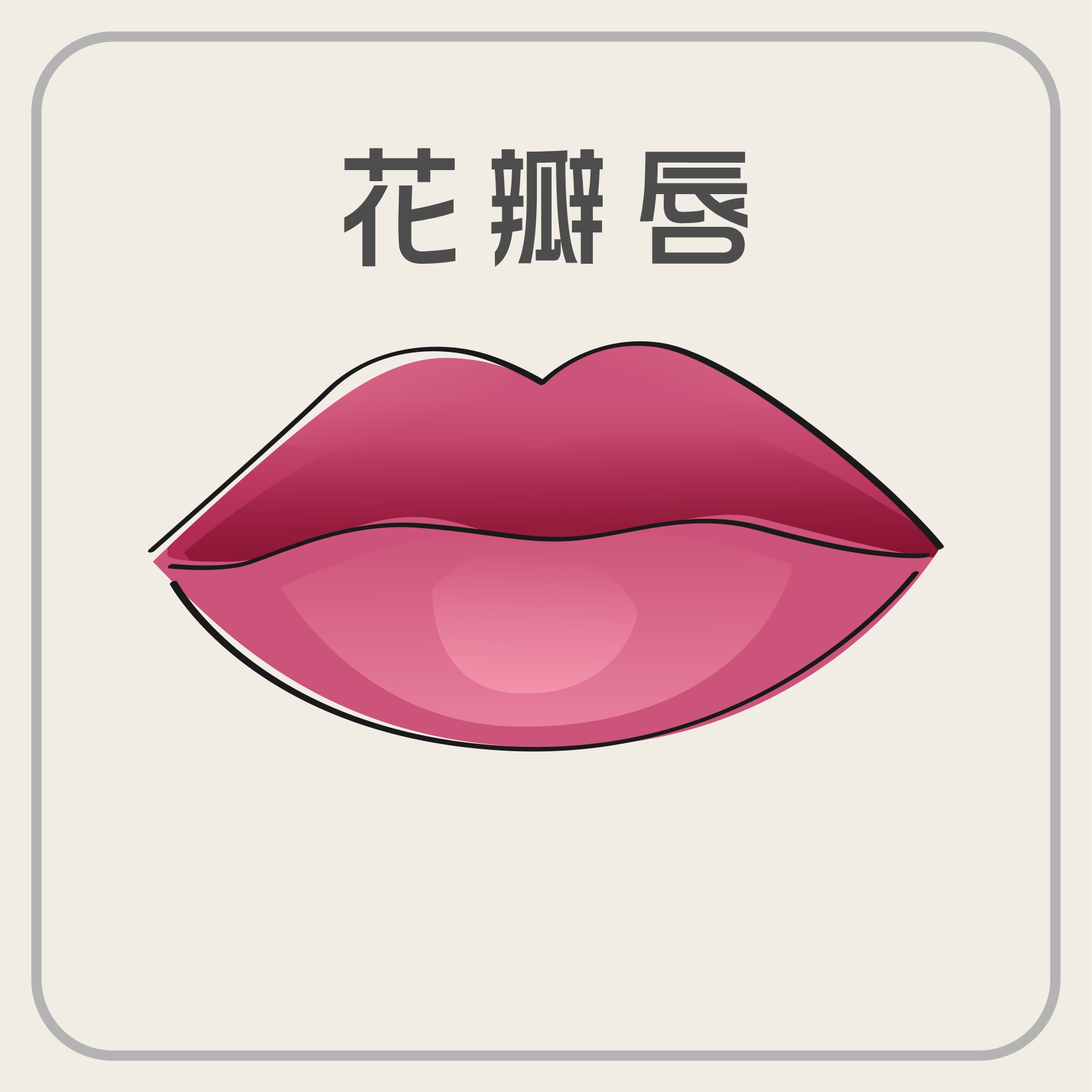 跟花瓣唇有一點像,區别在於唇峰的精致度,整個唇型偏圓,上下唇一起就像個圓圈。